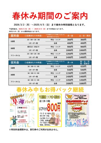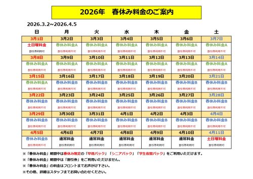 2026年 春休み料金のご案内(春休み限定のお得なパックもあります!)